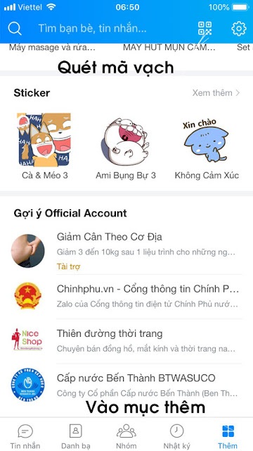 Bước 1 : Các bạn vào ứng dụng ZALO => Vào mục THÊM => trên thanh công cụ góc trái có biểu tượng check kiểm tra mã vạch các bạn ấn vào biểu tượng.