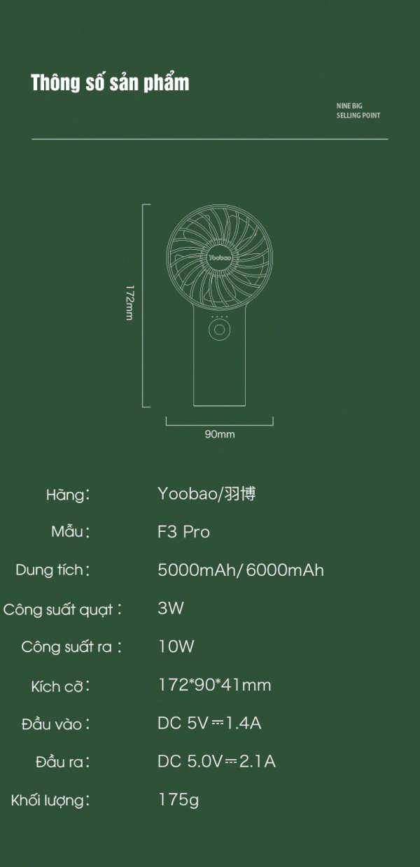 II. Thông số kỹ thuật của quạt tích điện Yoobao F3 3000mAh